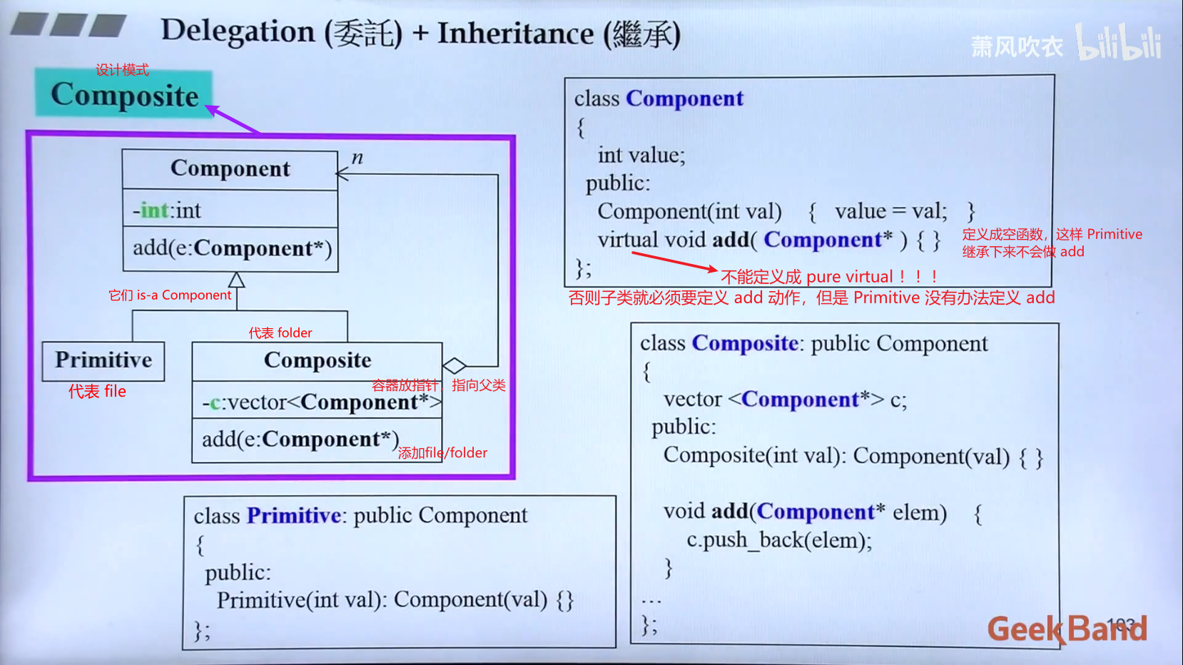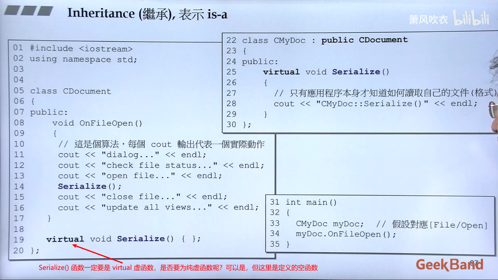 如下图,在父类 CDocument 中的一个函数 OnFileOpen() 中,打开文件中的很多操作都可以先写好,但是 Serialize() 读文件这个函数目前还无法确定,就可以把它延缓到写子类的时候来定义。这样当子类定义好这个函数,并且通过子类调用父类的 OnFileOpen() 函数的时候,当运行到 Serialize() 函数时,就会通过 this pointer 调用起子类对 Serialize() 的定义。这样的手法就叫做 Template Method。