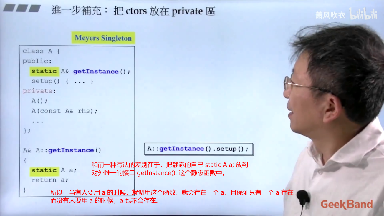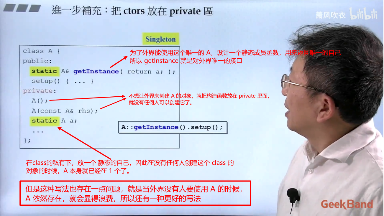 当我们写的 class,只希望产生一个对象的时候,就需要如下图方式来设计,这是一种叫做 Singleton 的设计模式,是一种非常好的做法。