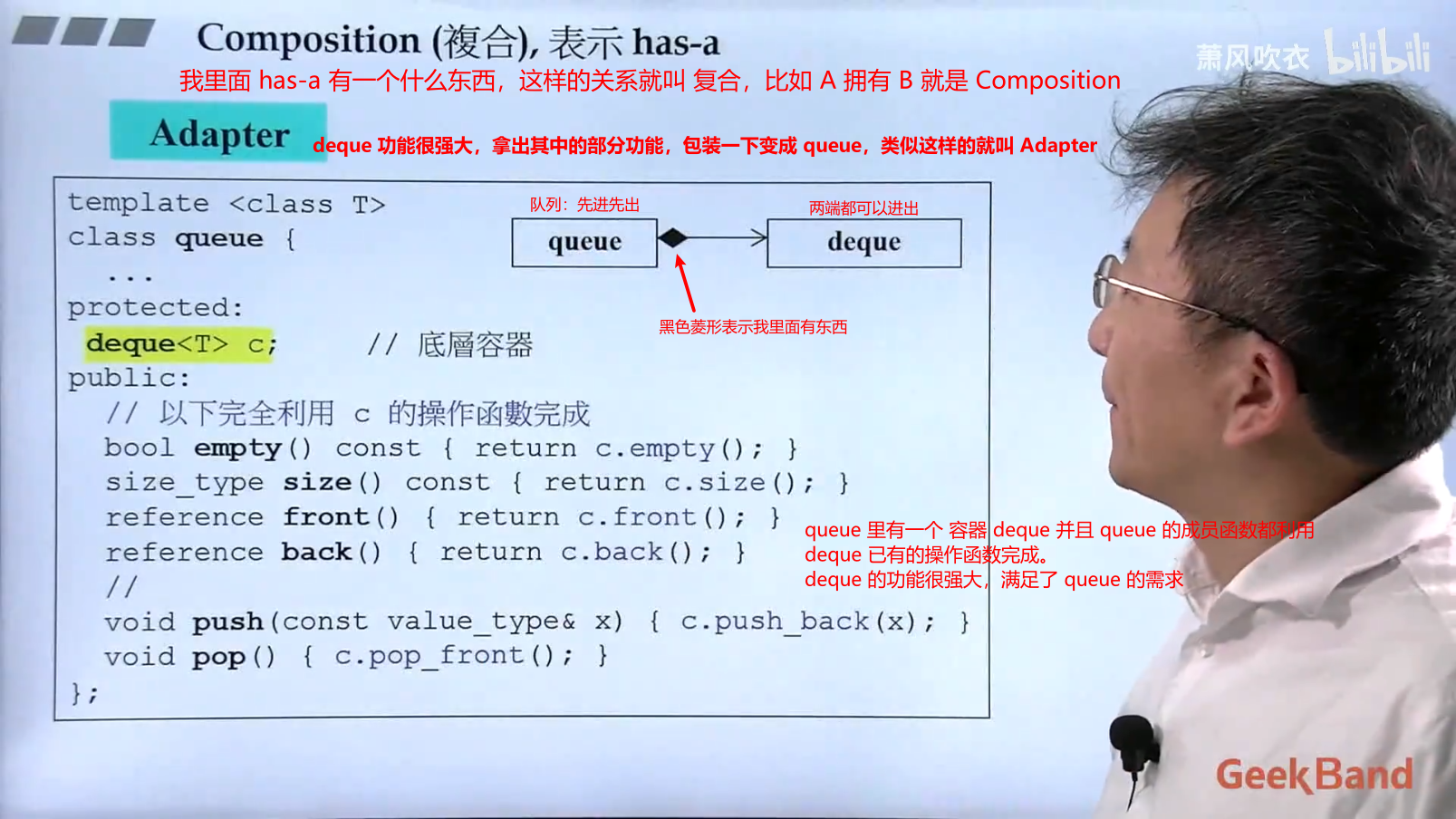 如下图,deque 的功能很强大,于是拿出其中的一部分功能,打包一下变成 queue,且 queue 的功能都可以由 deque 已有的函数完成,类似这样的就叫做 Adapter。